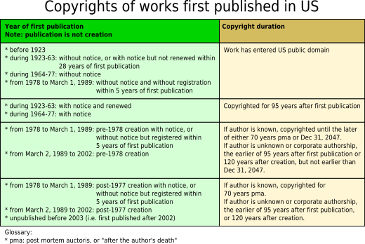 - ↑ For a definition of “publication” see e.g. Copyright Office circular, page 3. This modern definition is only valid for 1978 and later, as the 1909 Copyright Act did not explicitly define it, though the concepts were similar.