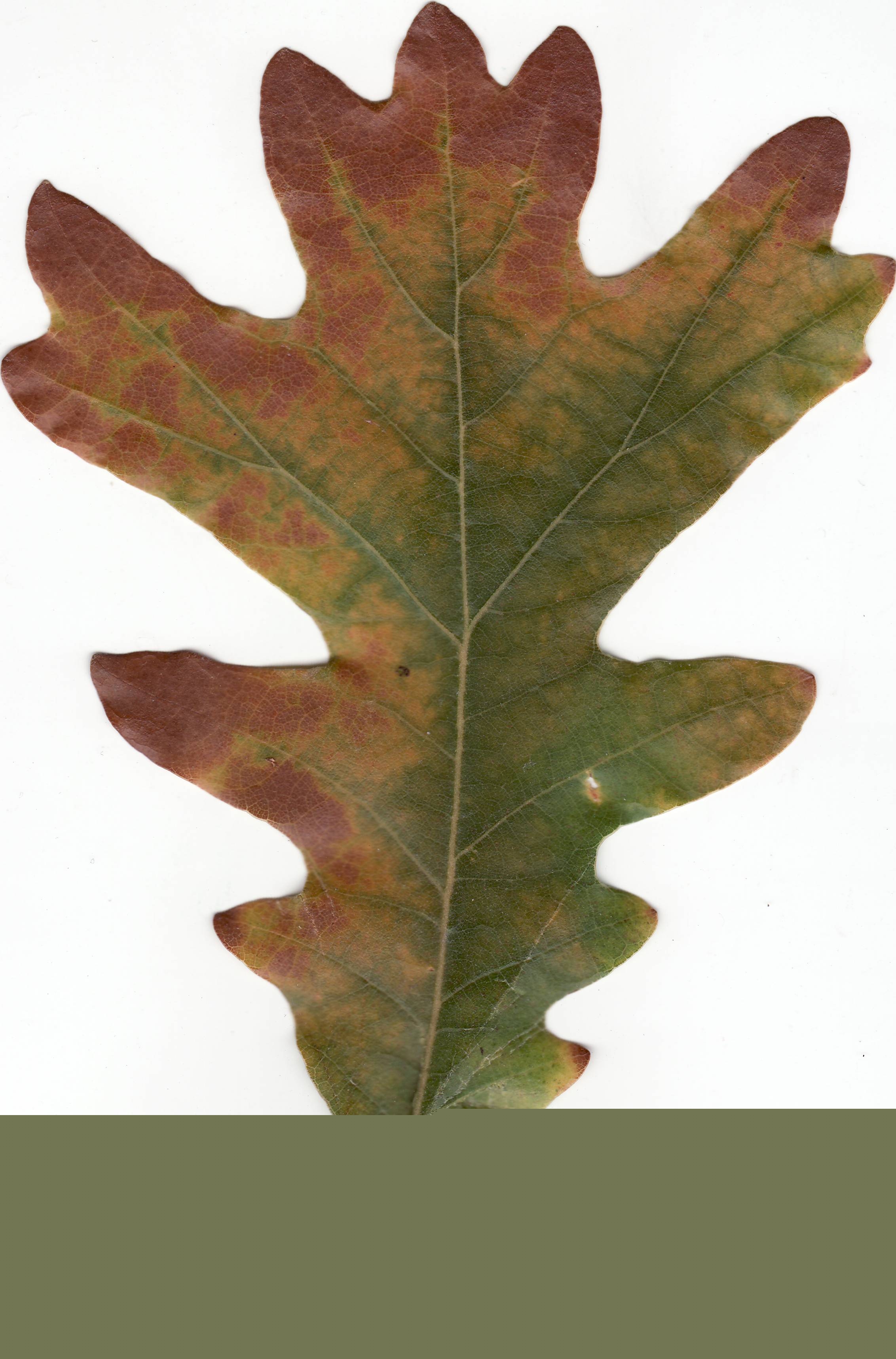 English: Scan of a leaf of a White Oak (Quercus alba L.) changing colors during autumn. The leaf was obtained on the campus of Brigham Young University.