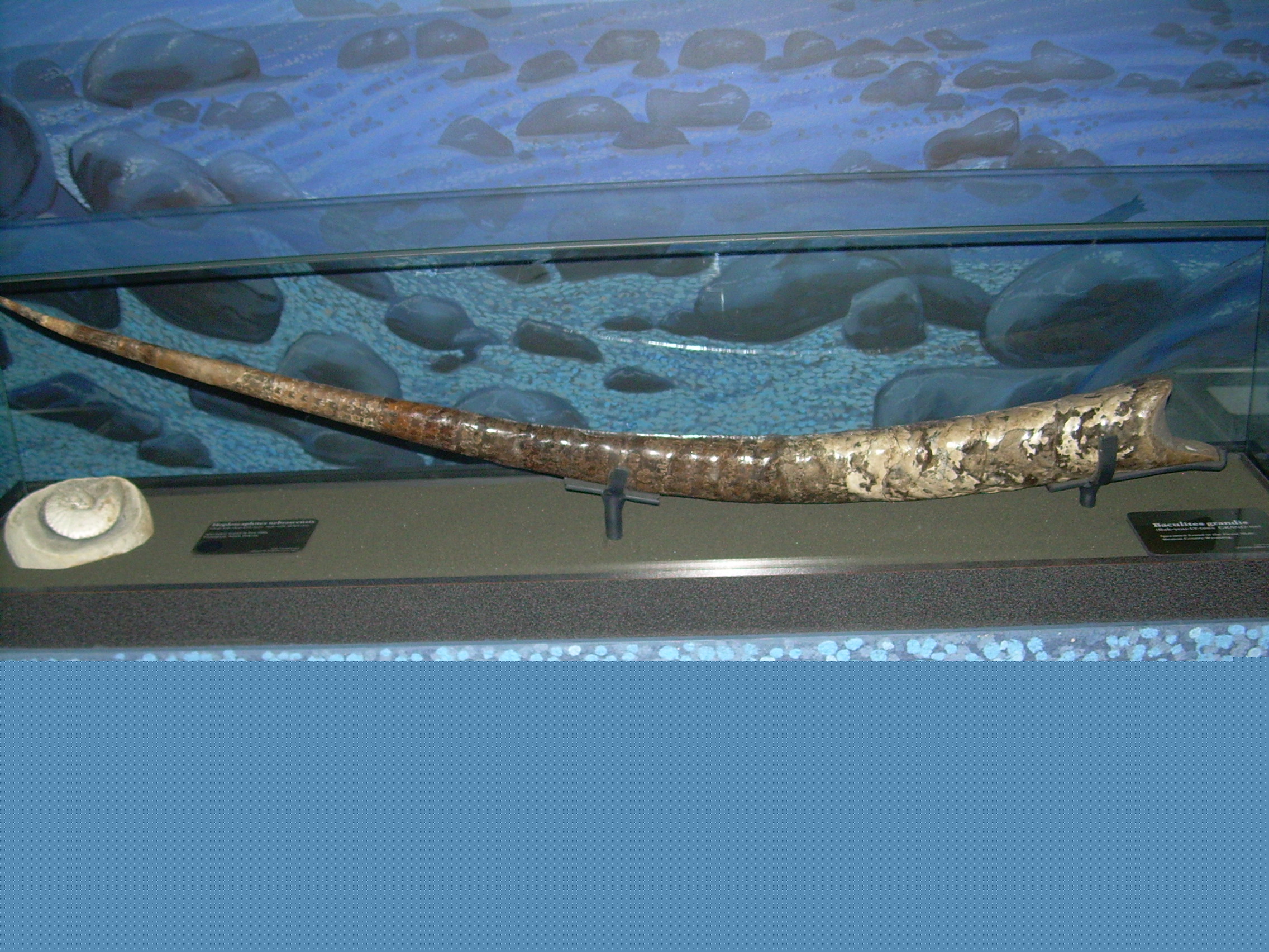 English: Photograph of a fossil cast of a Baculites shell taken at the North American Museum of Ancient Life.