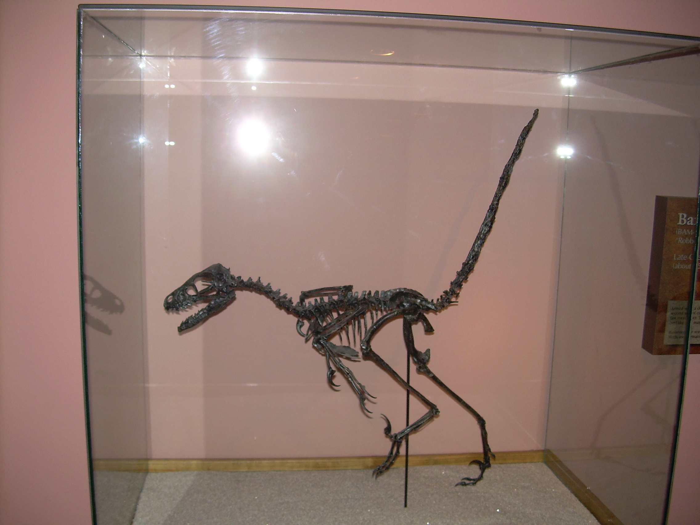English: Photograph of a fossil cast of a Bambiraptor feinbergi skeleton taken at the North American Museum of Ancient Life.
