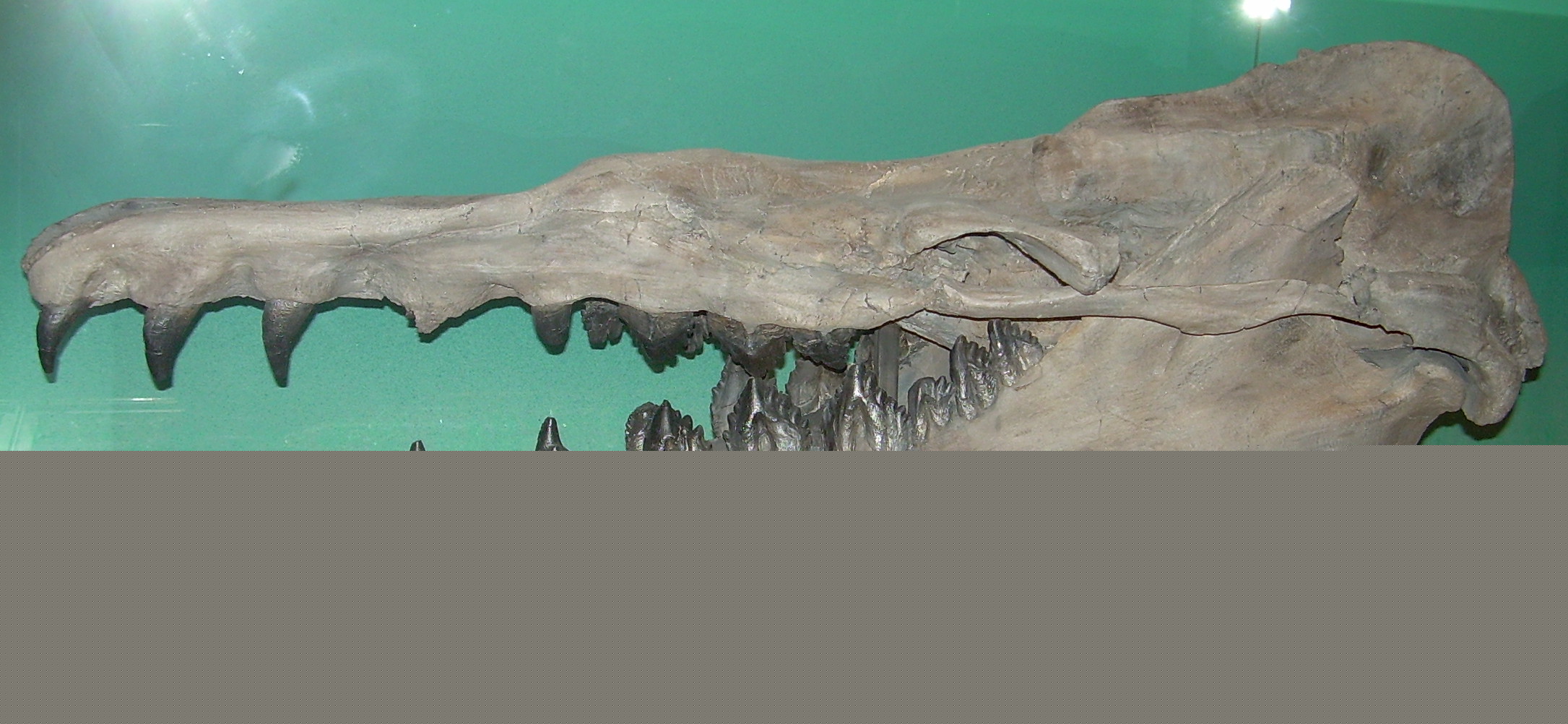 English: Photograph of a fossil cast of a Basilosaurus cetoides skull taken at the North American Museum of Ancient Life.