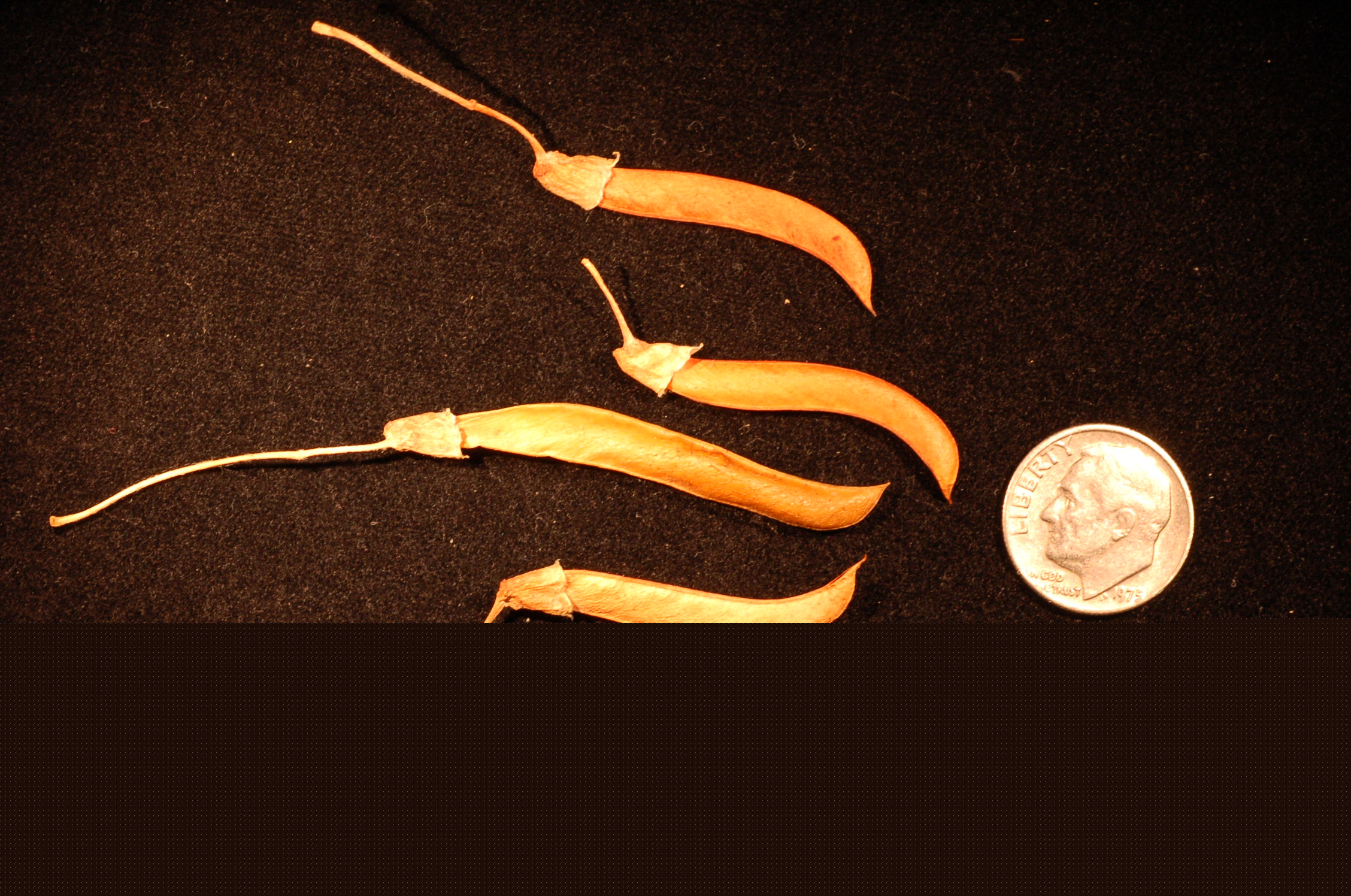 'English: Seed pods of Caragana arborescens next to a U.S. dime for scale.
