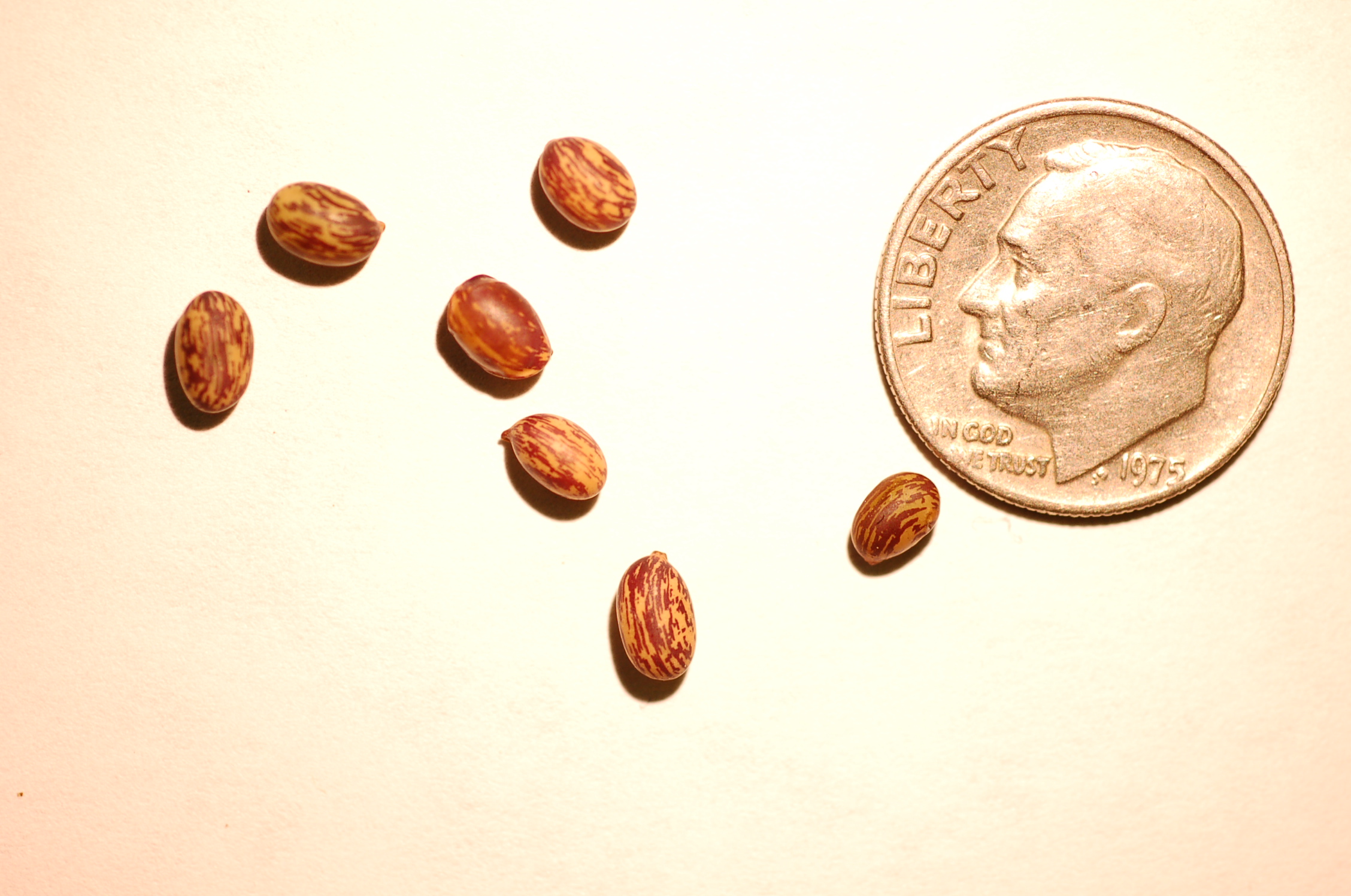 English: Seeds of Caragana arborescens next to a U.S. dime for scale.