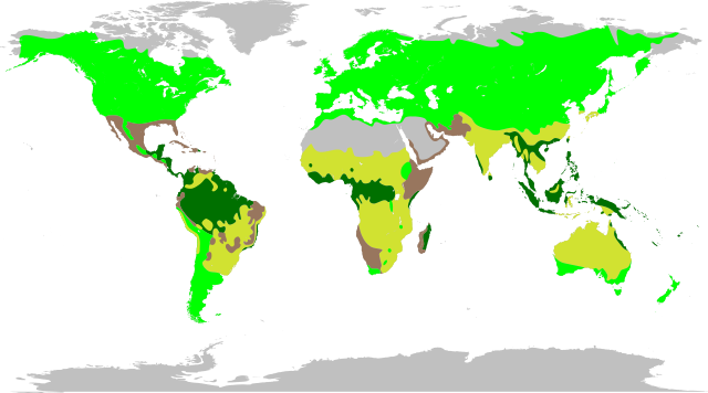 English: The major legume biomes, according to The Royal Botanic Gardens, Kew. Because the original map from The Royal Botanic Gardens, Kew and File:World map blank without borders.svg use different map projections, some ambiguity was introduced into this map. Thus it can only be taken to represent basic trends in legume biomes, not precise boundaries.