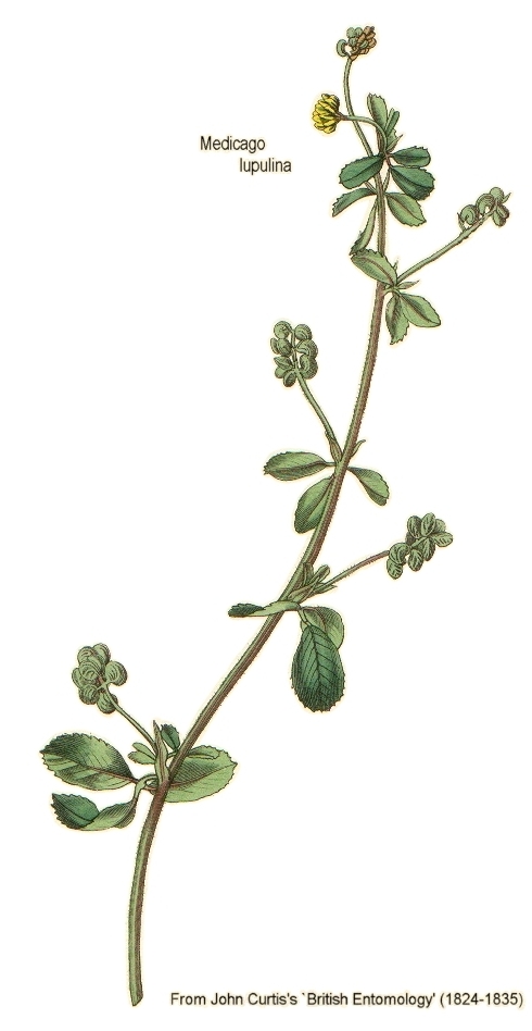 English: A plate from John Curtis's British Entomology, demonstrating the legume Medicago lupulina.