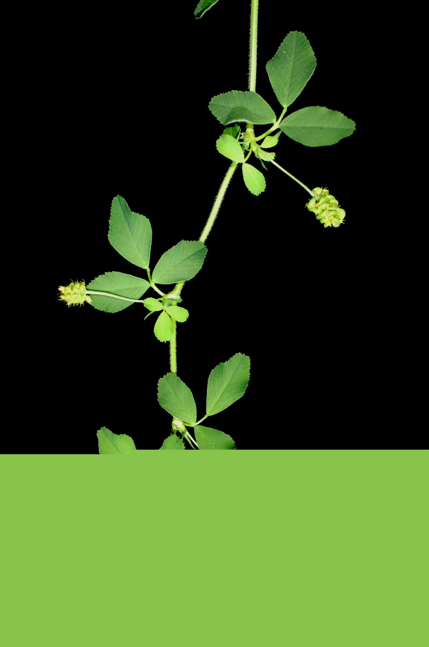 English: A branch of Medicago lupulina demonstrating leaf pattern, inflorescence, and seed pods.