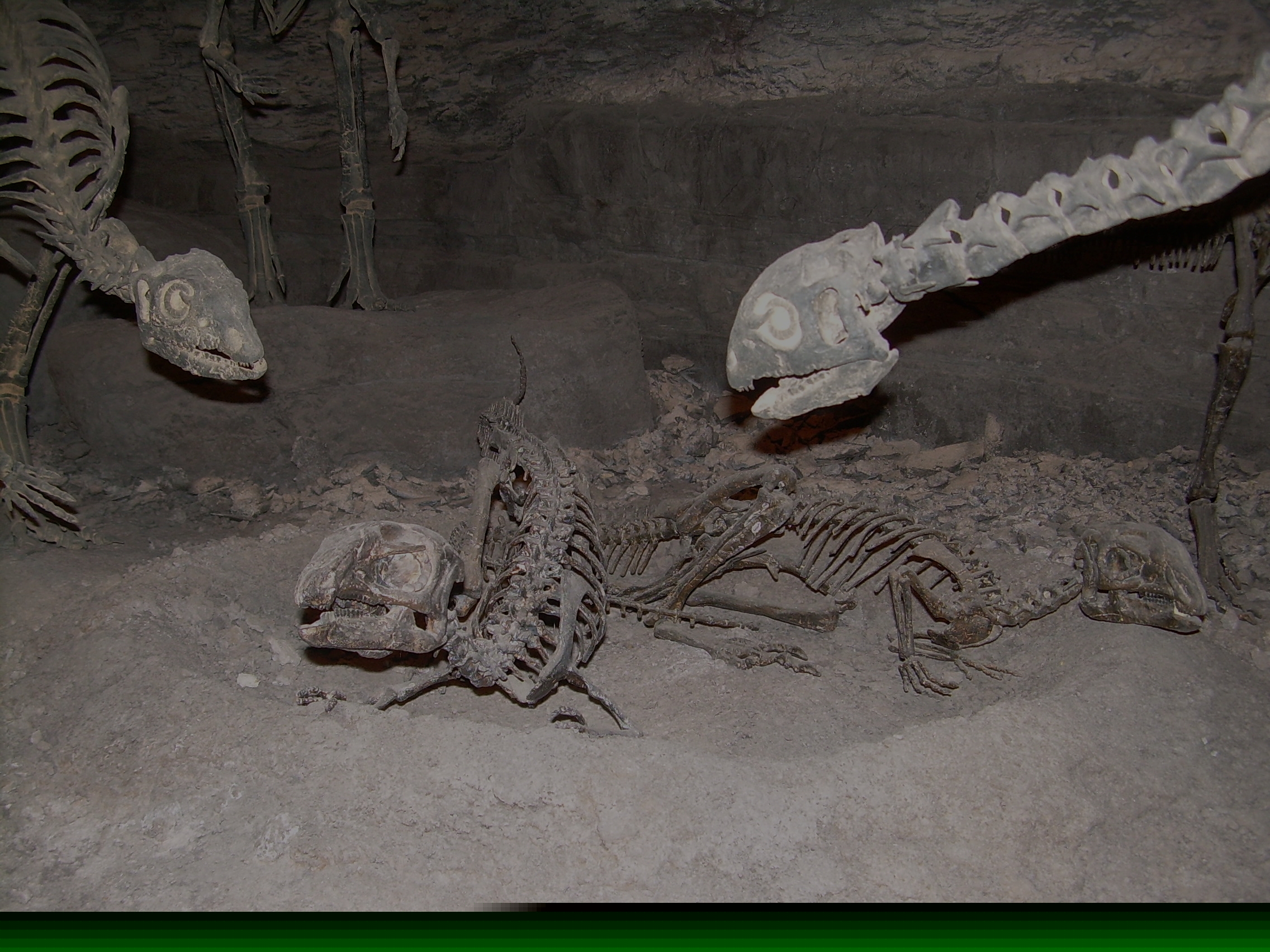 English: Photograph of a fossil cast of several Othnielia rex skeletons (shown around a nest) taken at the North American Museum of Ancient Life.