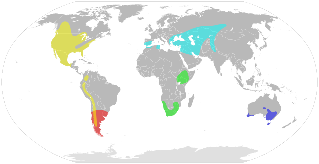 English: The distribution of the stiff-tailed ducks (Genus Oxyura) according to doi:10.1080/10635150590910249.