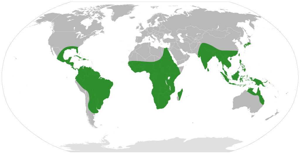 English: The distribution of the plant genus Pistia, according to [1].