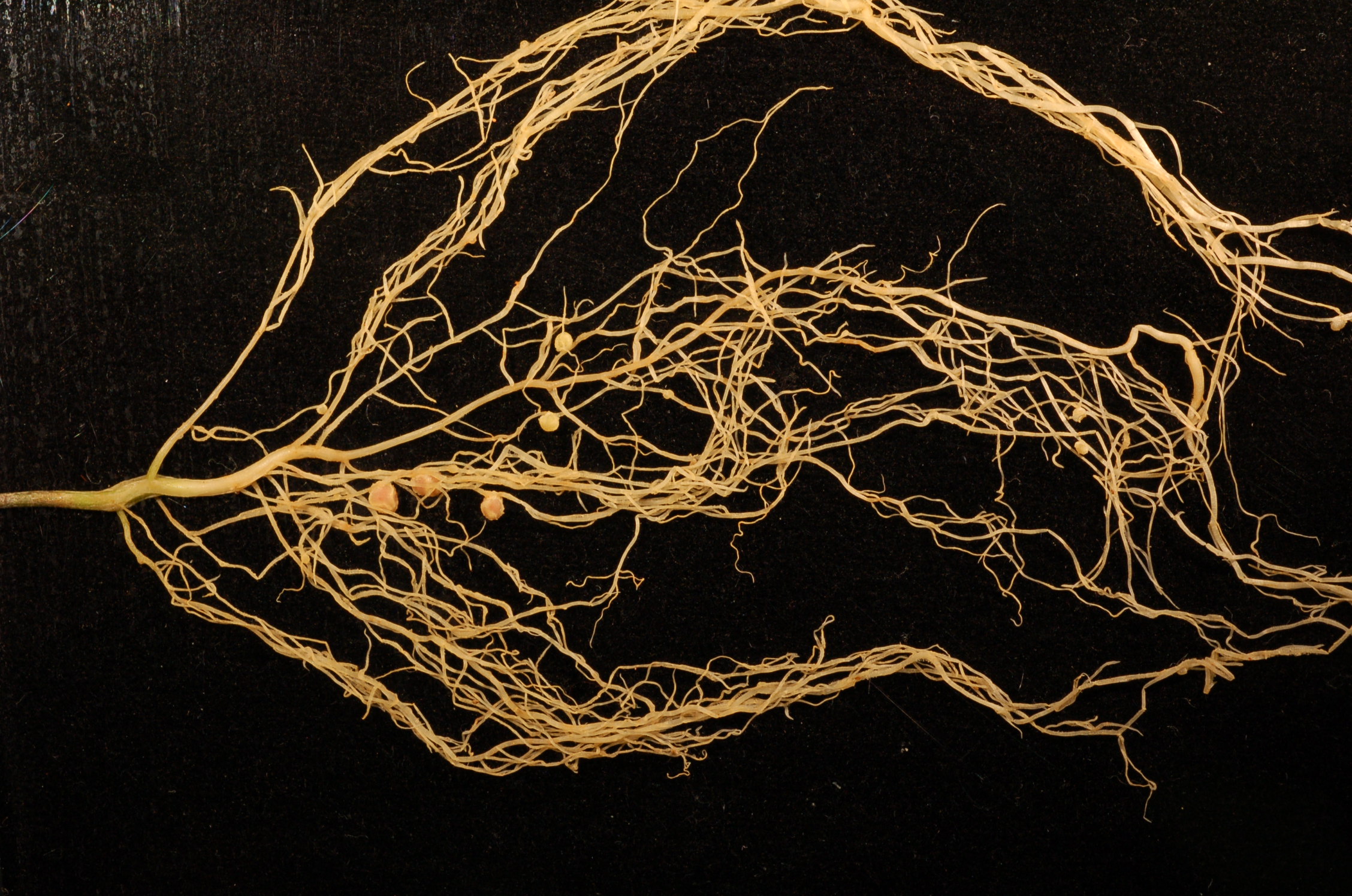 English: The root system (with root nodules) of a black locust (Robinia pseudoacacia) next to an American dime for scale.