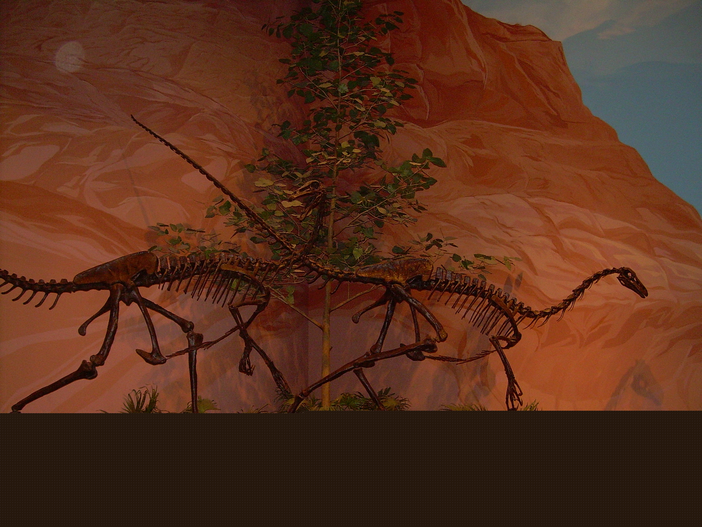 English: Photograph of fossil casts of Struthiomimus skeletons taken at the North American Museum of Ancient Life.