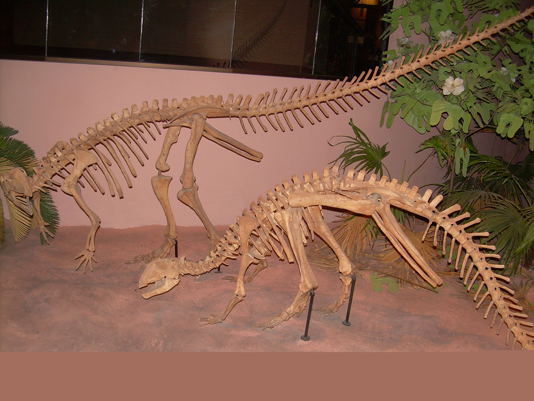 English: Photograph of casts of Thescelosaurus neglectus skeletons taken at the North American Museum of Ancient Life.
