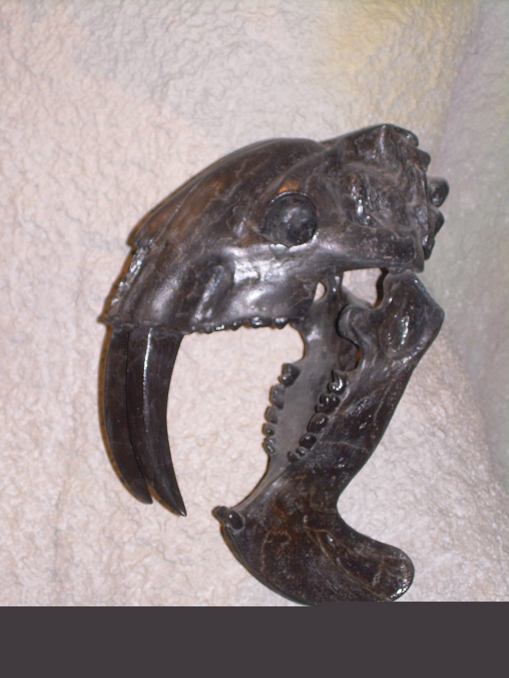 English: Photograph of a cast of a Thylacosmilus atrox skull taken at the North American Museum of Ancient Life.