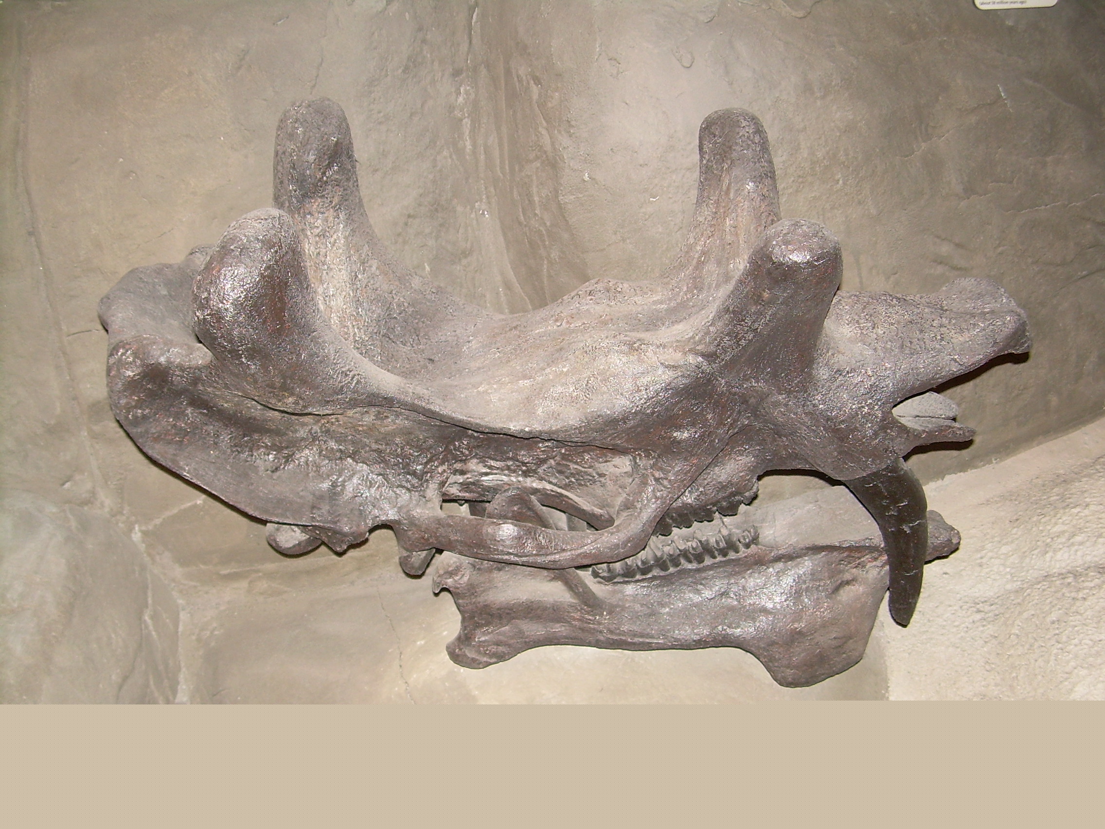 English: Photograph of a cast of a fossil Uintatherium anceps skull taken at the North American Museum of Ancient Life.