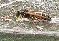 Passer domesticus bathing in water, Anas platyrhynchos in background